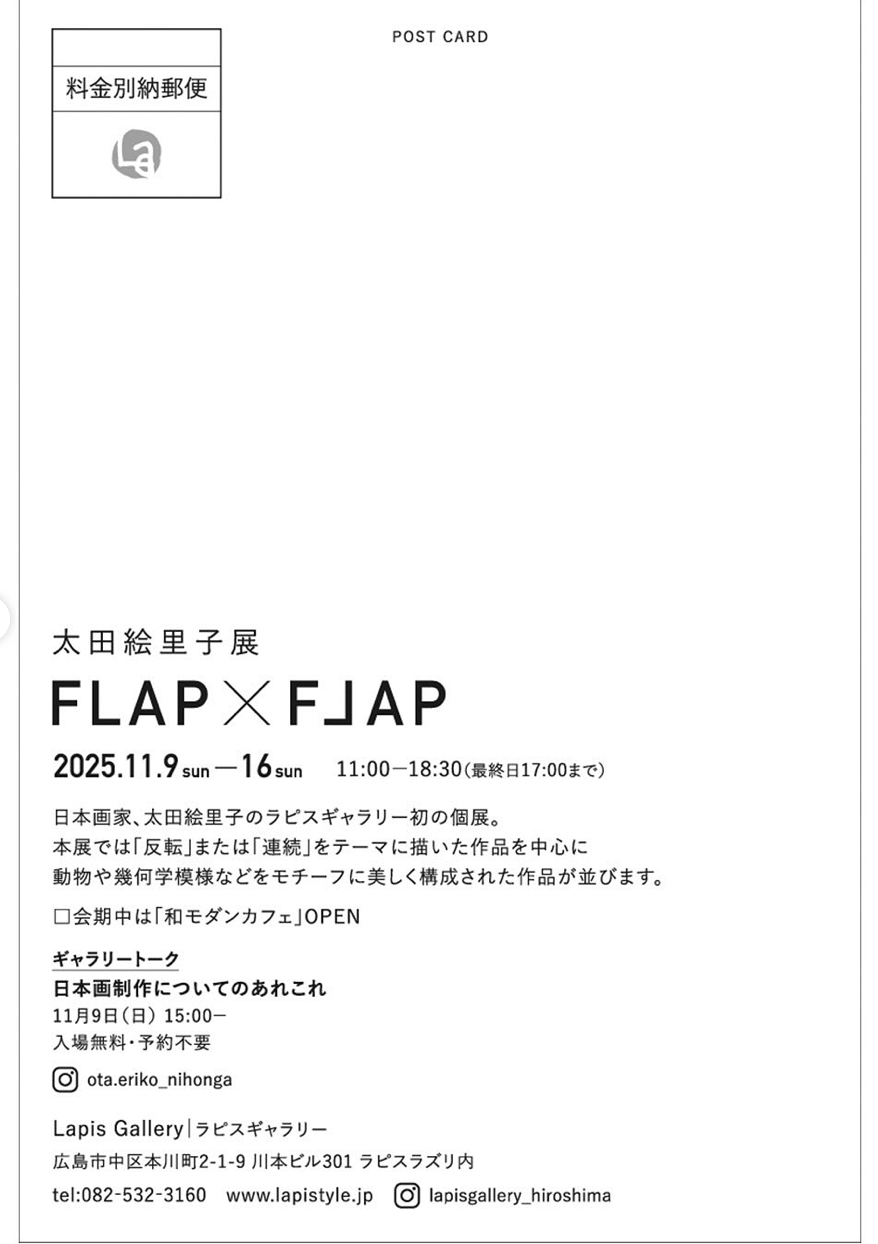 卒業生の太田絵里子さんがラピスギャラリーで個展を開催しています