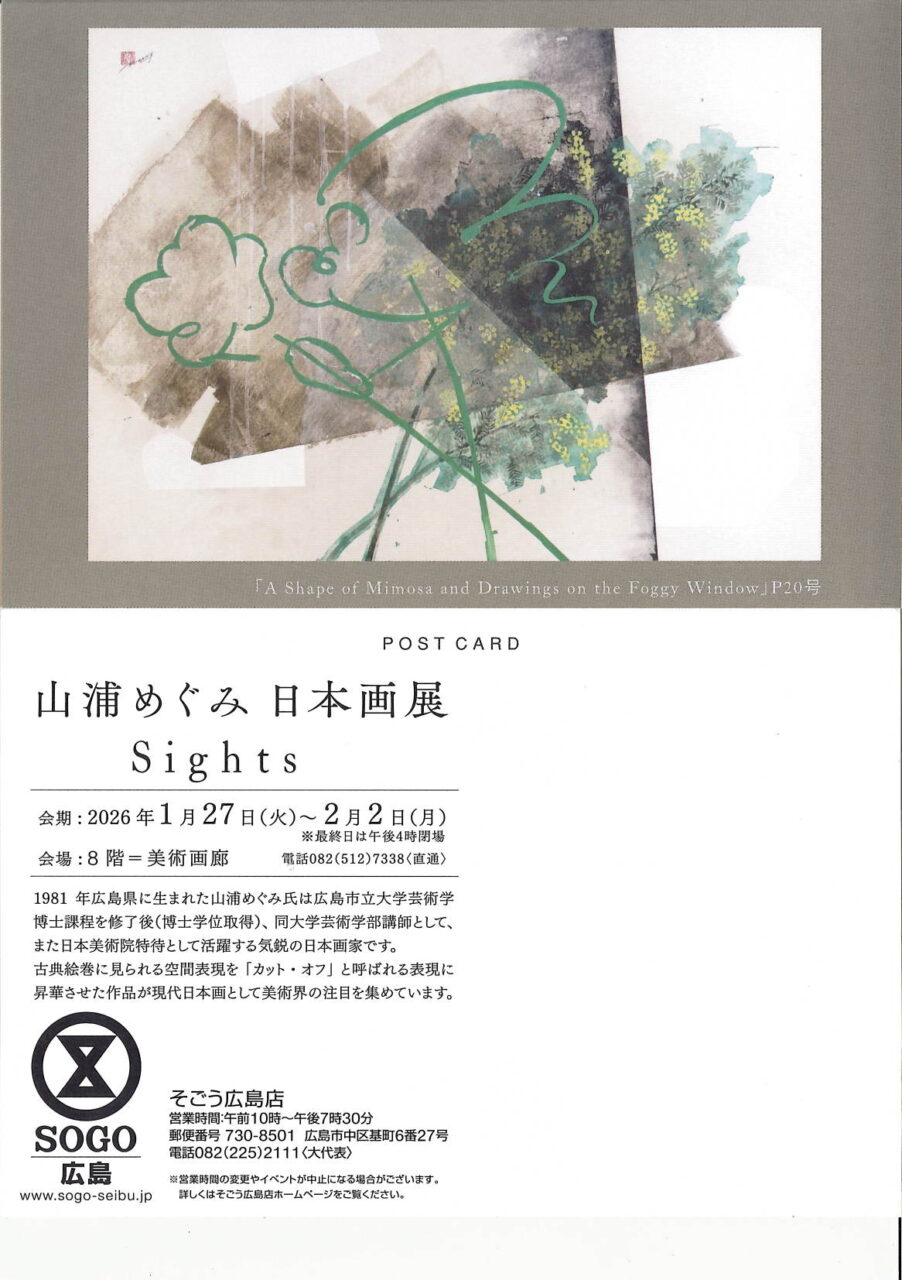 山浦めぐみ講師が 個展 を開催されます。【会期:令和8(2026)年1月27日(火) ~ 令和8(2026)年2月2日(月)】 投稿日: 2026年1月23日2026年1月23日 投稿者: nihonga 山浦めぐみ 個展 −Sights− 会期:令和8(2026)年1月27日(火) ~ 令和8(2026)年2月2日(月) 時間:10:00~19:30 最終日16:00閉場 会場:そごう広島8階 美術画廊 広島県広島市中区基町6-27 082-225-2111(代表)